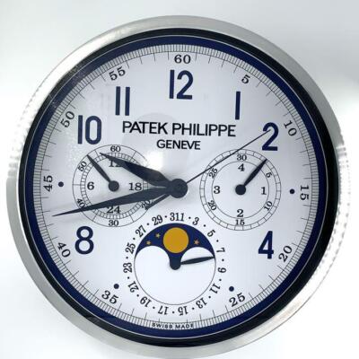 . A Patek Philippe showroom display wall clock with a circular polished and brushed finish silver metal case with a white face with black Arabic numerals with silver metal arms. The clock runs on one AA. 179 for shipping.
